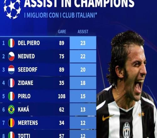 意甲球员欧冠历史助攻榜:皮耶罗、内德维德、西多夫前三